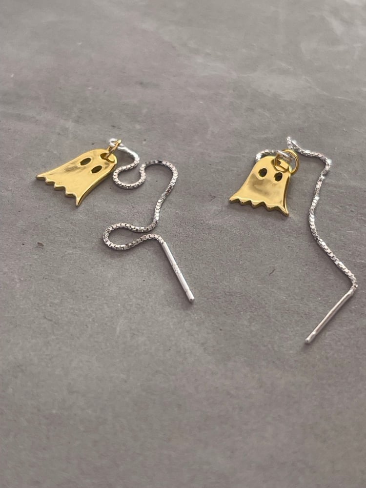 These eeriest of earrings are 24garrotte ghould plated sterling sliver (gallmarked!) Hanged on 7cm box chain threader to weave through your piercings or simply dangle if you’ve just the one.